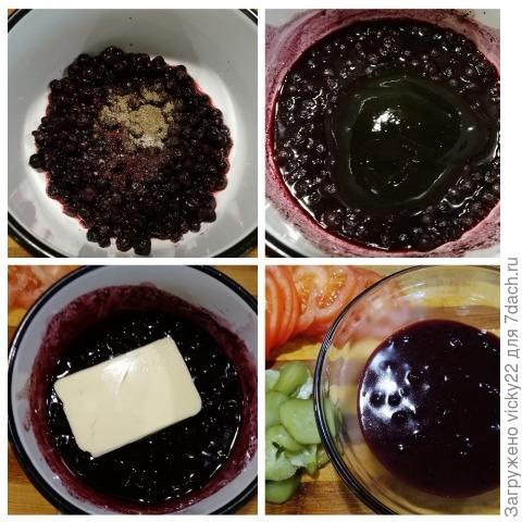 Для черничного соуса можно взять не размороженную чернику, добавить соль, сахар, перец и проварить 5 минут. Затем добавляем соевый соус или терияки и сливочное масло. Варим еще 5 минут до загустения.