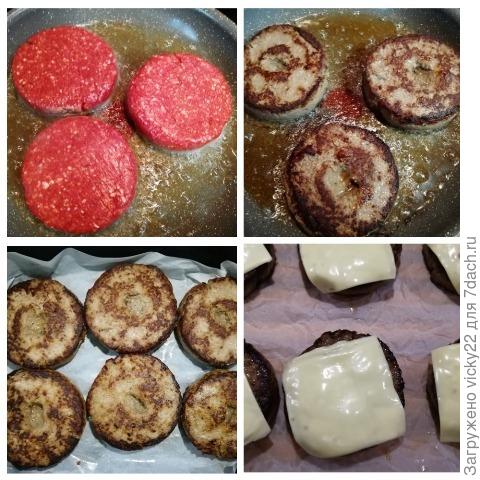 Разогреваем сковороду до дымка с небольшим количеством растительного масла. Кладем котлеты дырочкой вниз и жарим 1 минуту, переворачиваем и жарим еще 1 минуту.