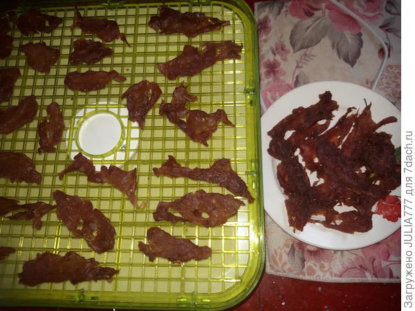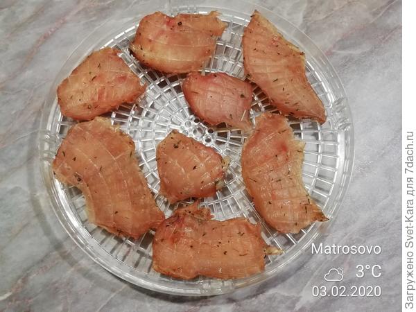 Включаем сушилку, устанавливаем температуру около 60⁰С. Вялим мясо 6-8 часов. Это зависит от выбора части туши. У меня нежная свиная вырезка, она была готова через 6 часов. За время приготовления я 3 раза поменяла местами решетки и 3 раза перевернула мясо. Готовое мясо должно хорошо гнуться, но не ломаться.