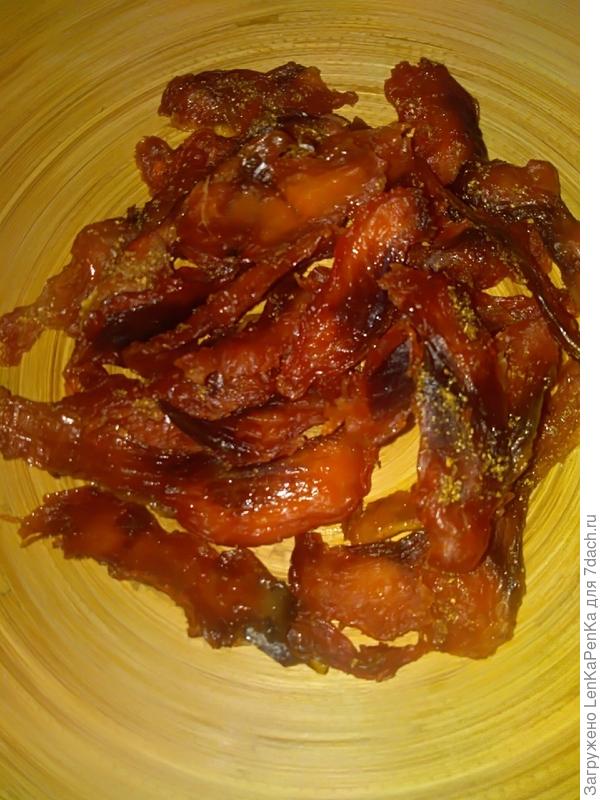 Готовые мясные чипсы остужаем и храним в герметично закрытой емкости. Хотя у меня такие чипсы съедаются просто молниеносно. Обычно за один день я готовлю сразу три вида джерок: из говядины (5-6 часов), из свинины (6-8 часов), из куриной грудки (5-7 часов).