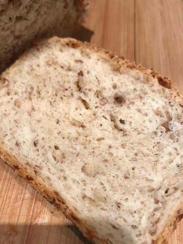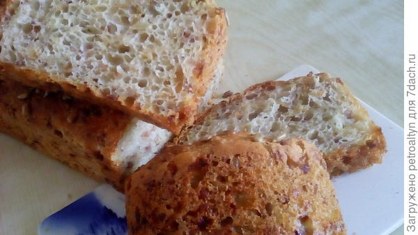 Остывший хлеб нарезаем. Мякушка просто необыкновенная, а какой аромат! Форма получилась не очень фотогеничная, но на то он и домашний хлеб, ведь для нас главное — вкус.