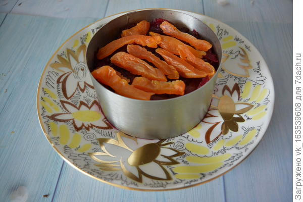 В кольцо между слоями свёклы укладываем чернослив, изюм.